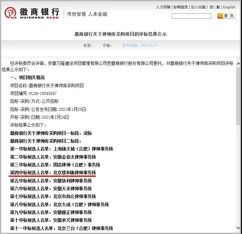 2021年伊始,北京德和衡律师事务所金融业务部陆阳律师团队再传捷报,成功入围徽商银行股份有限公司(简称为“徽商银行”)非诉业务律师库。近些年来,金融业务部银行业绩增长迅速,此次入选徽商银行非诉业务律师库,是继国家开发银行、中国进出口银行、光大银行、中信银行、邮储银行等银行后,又一家大型银行选择德和衡律师事务所为其提供法律服务。