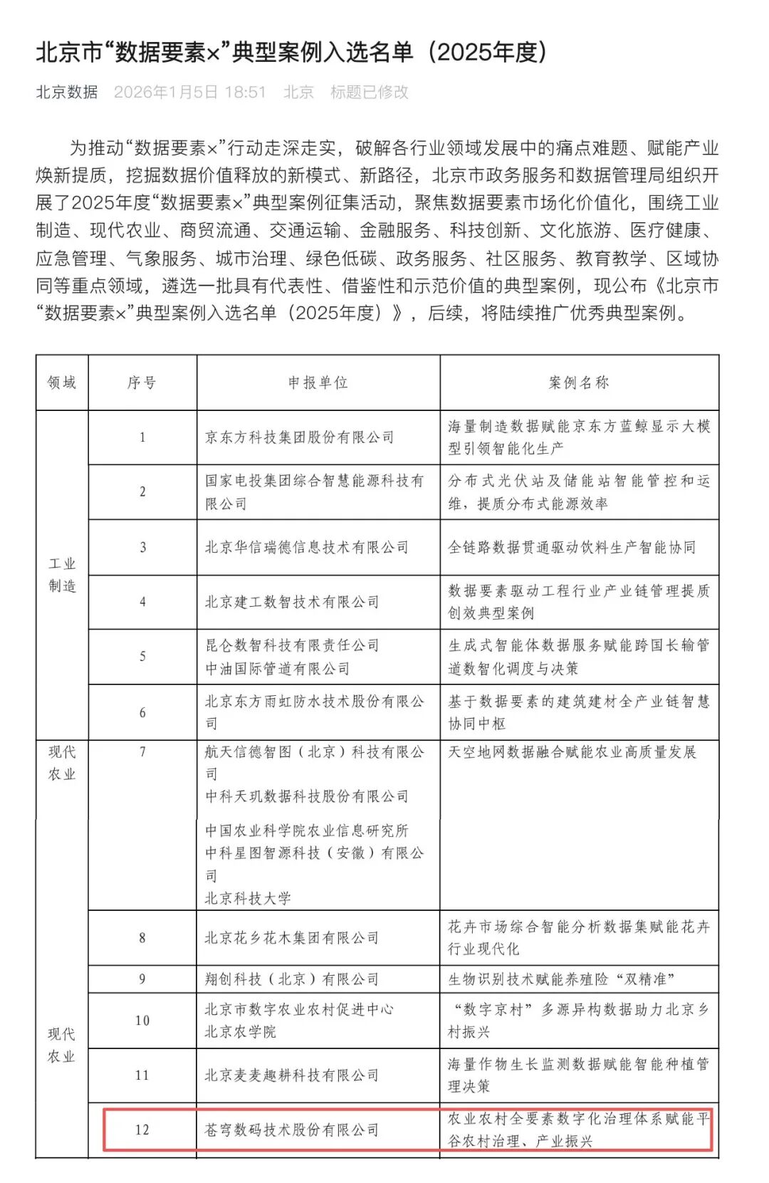 近日,北京市政务服务和数据管理局2025年度“数据要素×”典型案例征集结果正式揭晓,我会副会长单位苍穹数码申报的《农业农村全要素数字化治理体系赋能平谷农村治理、产业振兴》案例,成功入选现代农业领域典型案例!