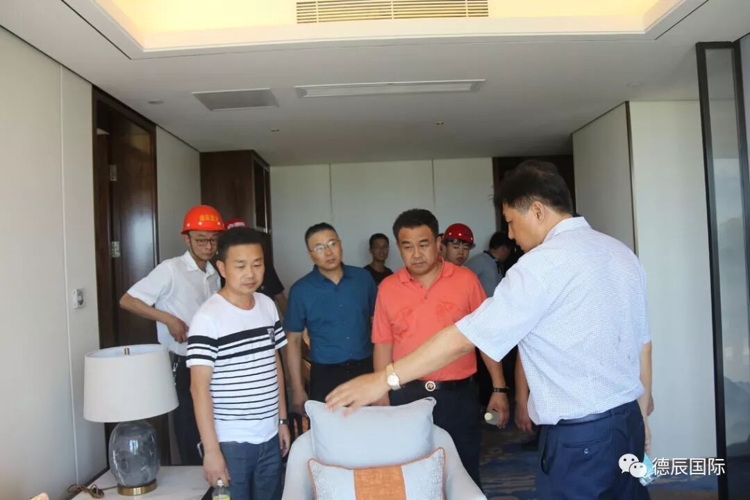 7月18日下午,德辰国际董事长何学德先生、副总经理丁胜祥、何勤、胡乔及德辰国际工程部人员陪同南京金陵酒店管理公司副总裁王宝樑先生、人力资源部总监冯丹、营运中心副总监李育蓓一行现场参观德辰金陵大酒店客房样板间及酒店功能区,对下一步筹备开业及人员配备情况与德辰国际领导进行沟通。
