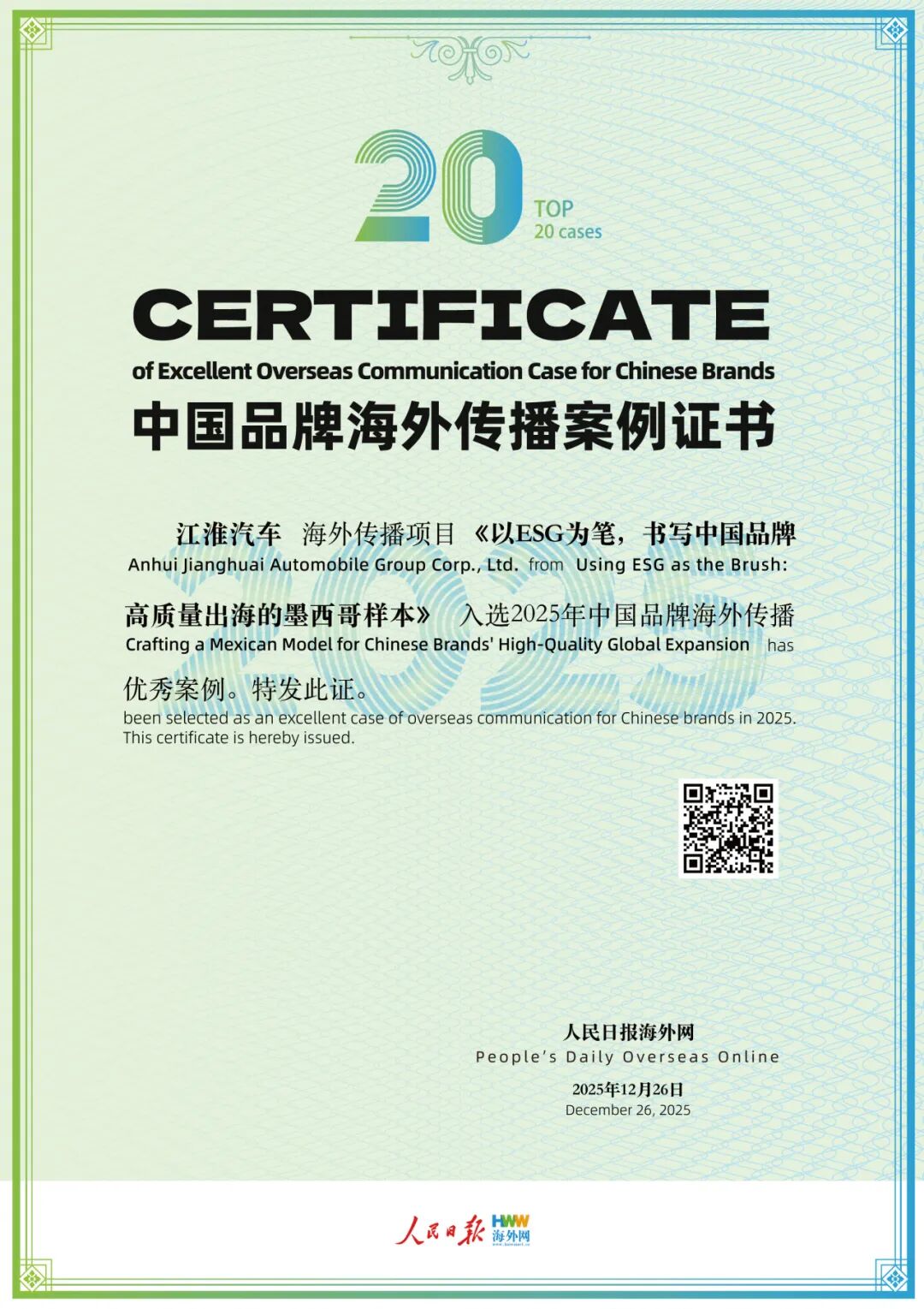2025年12月26日,由人民日报海外网、中华环保联合会与中国质量认证中心联合主办的“第三届中国品牌形象海外传播论坛暨2025中国企业ESG蓝皮书发布会”在人民日报社隆重举行。我会副会长单位江淮汽车凭借在海外市场的卓越表现以及在ESG领域的创新实践一举斩获双重荣誉:成功入选“2025中国出海品牌100强指数”,其海外传播项目《以ESG为笔,书写中国品牌高质量出海的墨西哥样本》获评“2025中国品牌海外传播优秀案例”,彰显了中国汽车品牌在全球化进程中的综合实力与可持续发展责任担当。